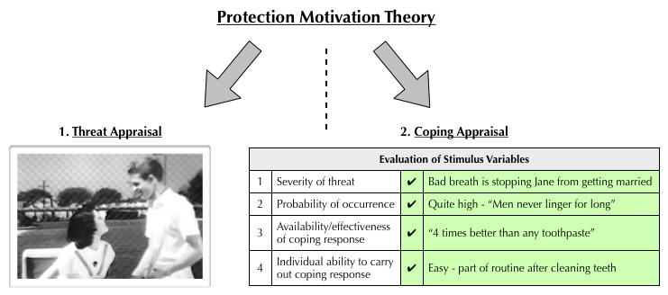 So how do fear appeals influence consumers? Rogers’ Protection Motivation Theory (1975) provides one explanation. The premise of the Protection Motivation Theory is that people are motivated to protect themselves from physical, psychological and social threats. When faced with a new threat (the fear appeal), this initiates a coping appraisal based on four variables; the severity of the threat, probability of the threat occurring if no adaptive behaviour is performed, availability of a coping response (solution), and the individual’s ability to carry out the coping behaviour.